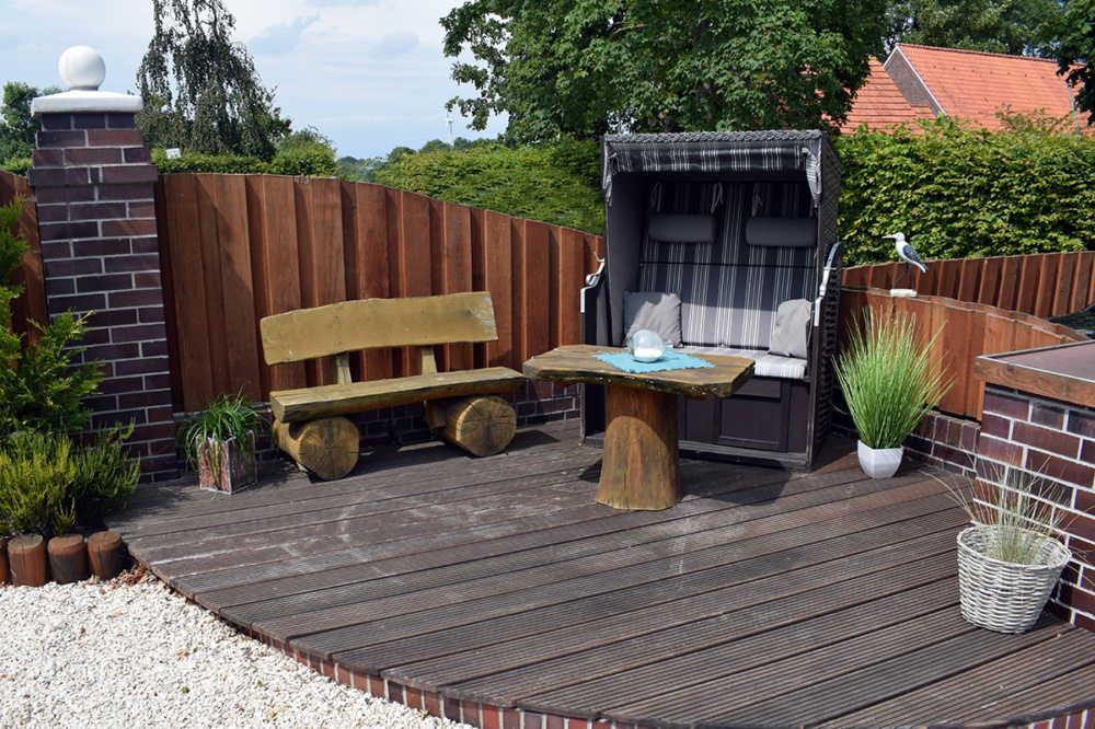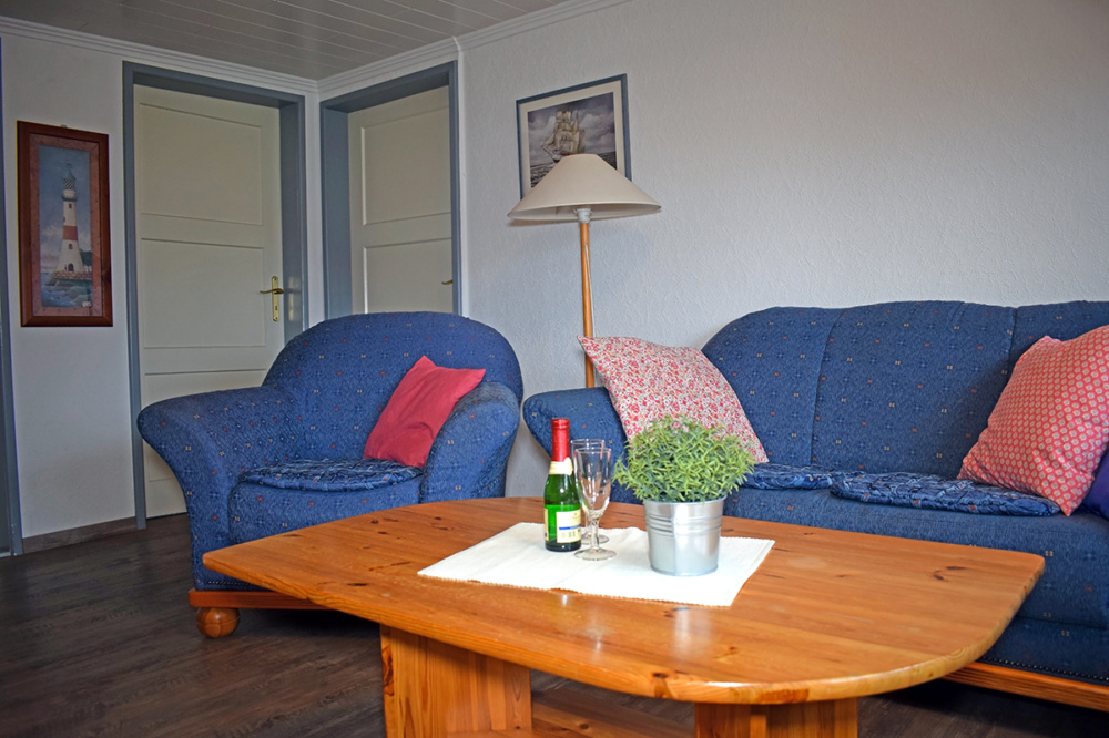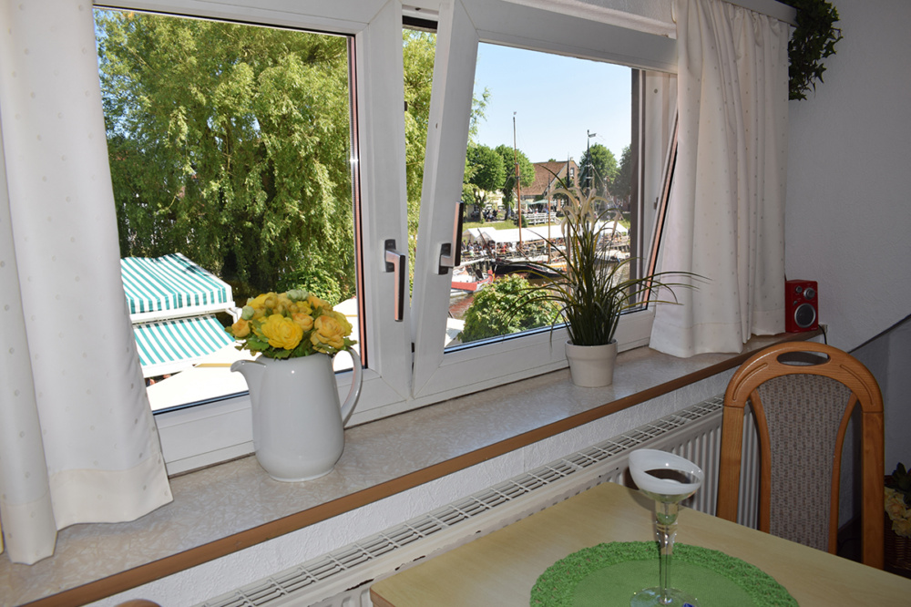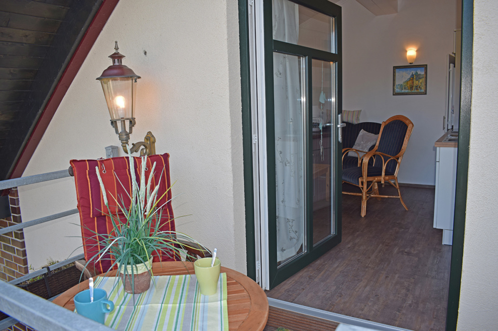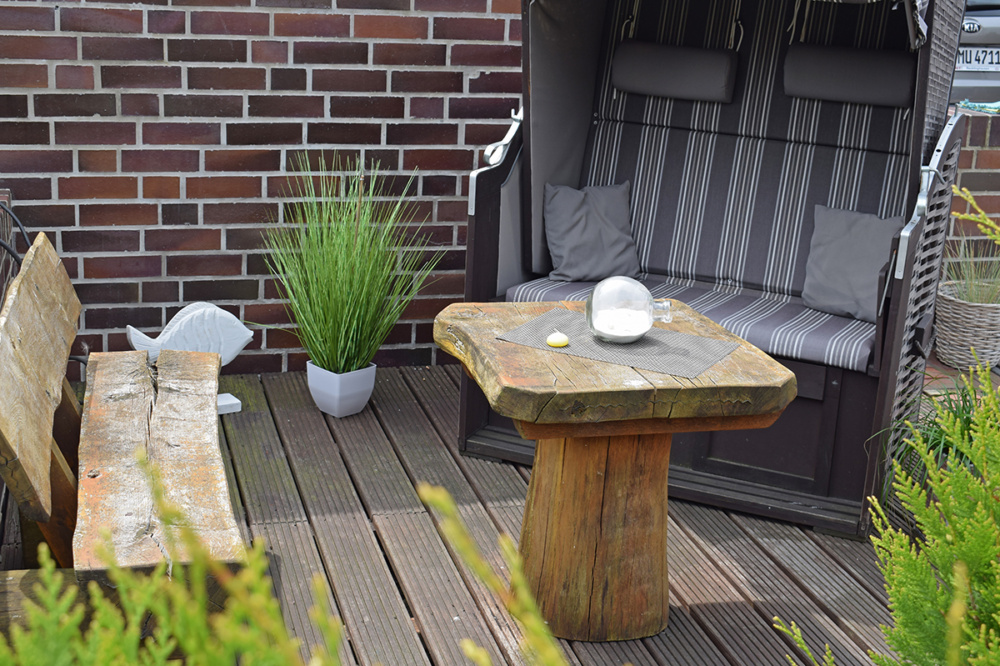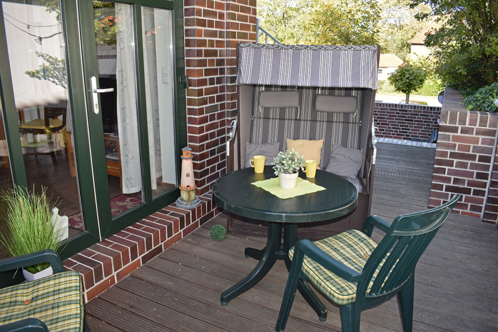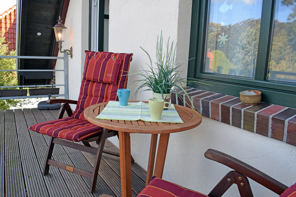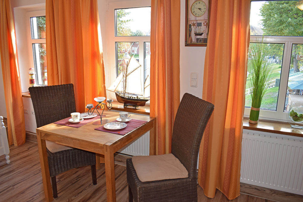 55 m² große Ferienwohnung im Obergeschoss mit Wohnzimmer, separater Küche, Schlafzimmer und Bad mit Dusche, Blick auf den Hafen, im Außenbereich Sitzecke mit Strandkorb.