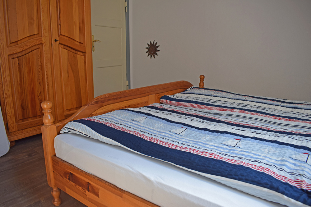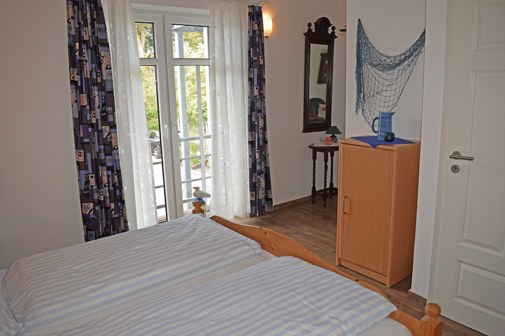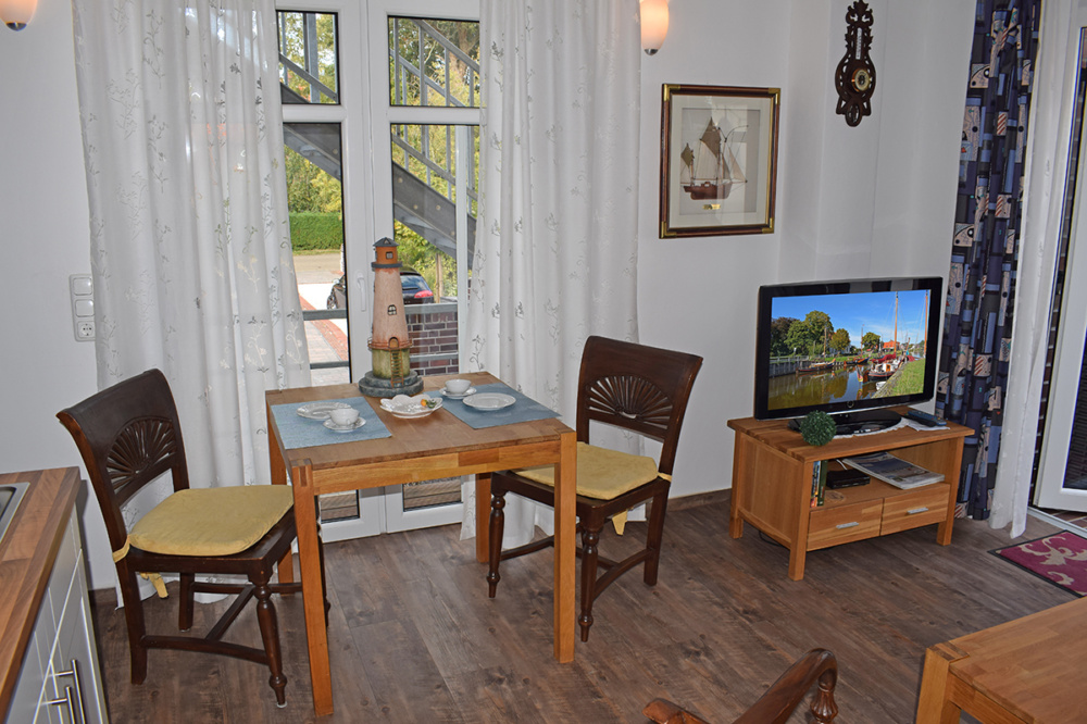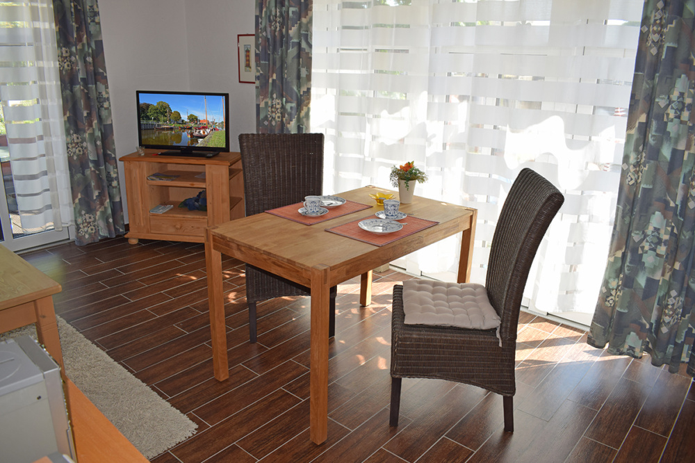 35 m² große Ferienwohnung im Erdgeschoss mit Wohn-/Esszimmer inkl. Einbauküche und räumlich abgerenztem Schlafbereich, Bad mit Dusche, Terrasse mit Strandkorb, Gartenmöbeln und Blick auf den Museumshafen.