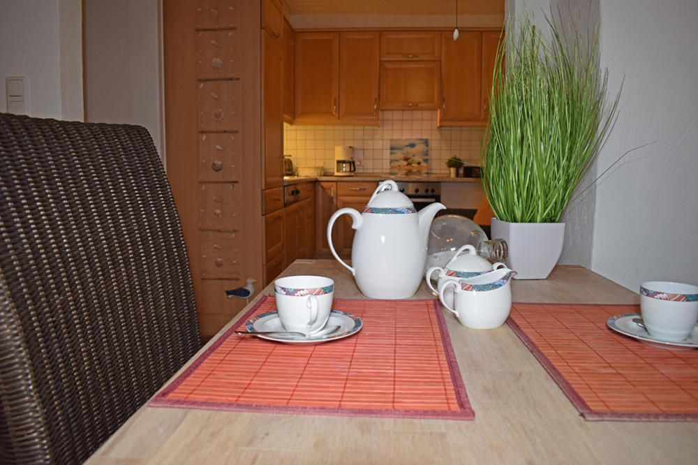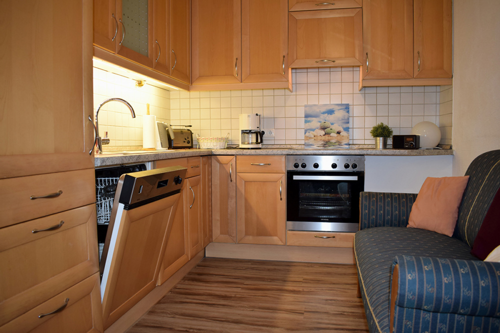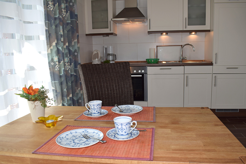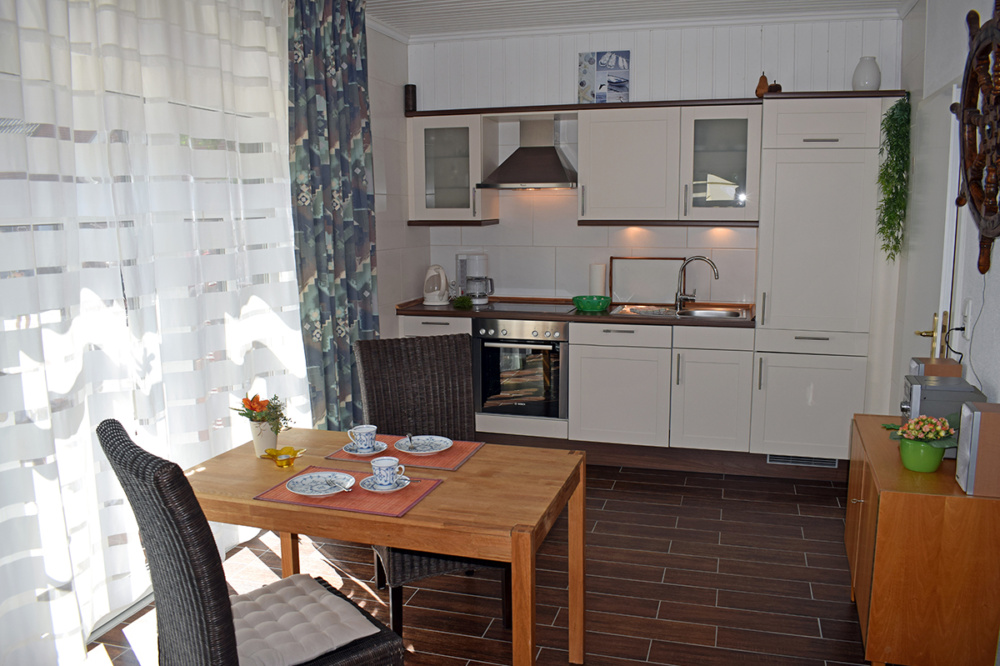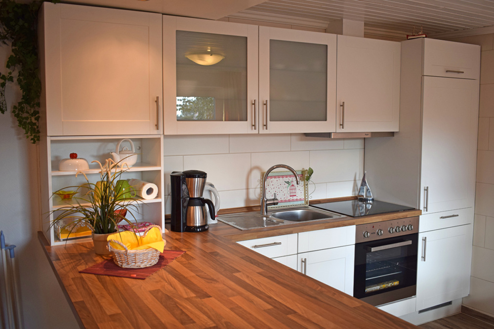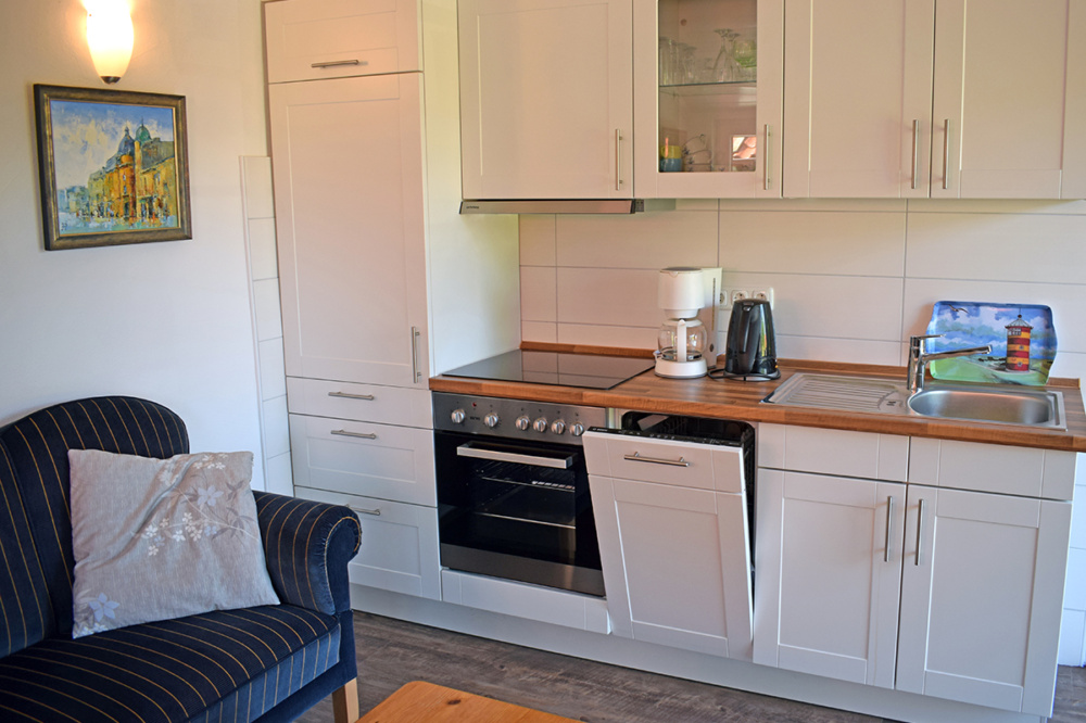 Die Küchen sind ausgestattet mit Kühlschrank, Ceran-Kochfeld (in der Fewo Bootsmann 2-Plattenherd), Backofen (außer Fewo Bootsmann), Kaffeemaschine, Wasserkocher, Toaster und Geschirr.