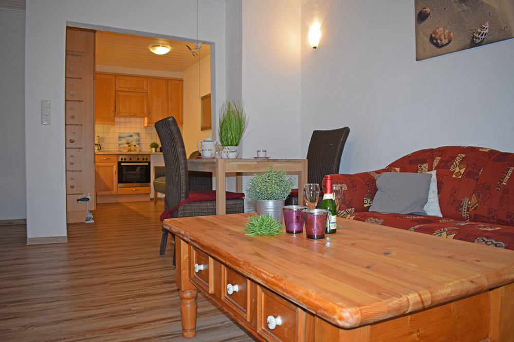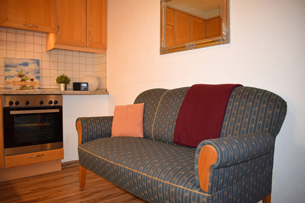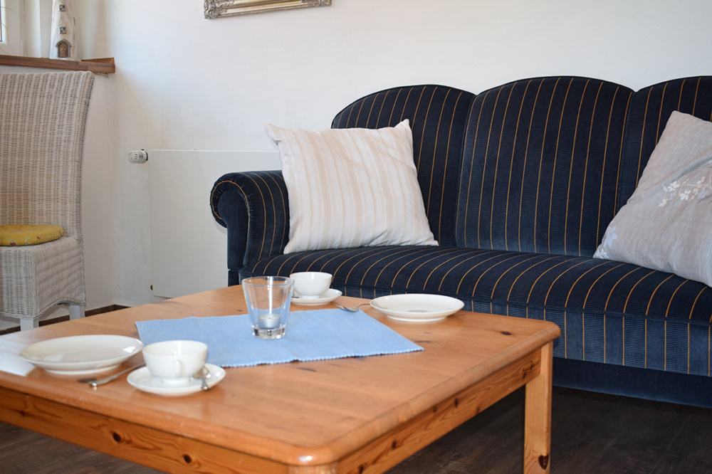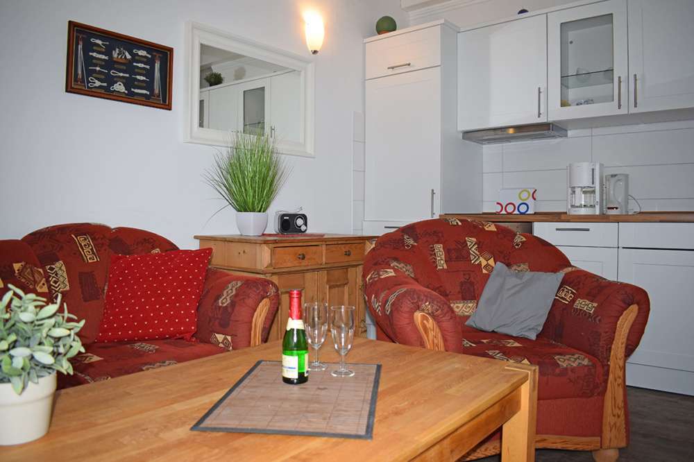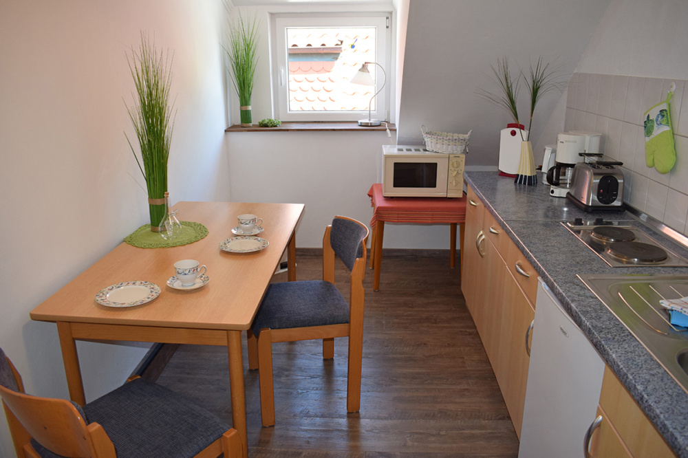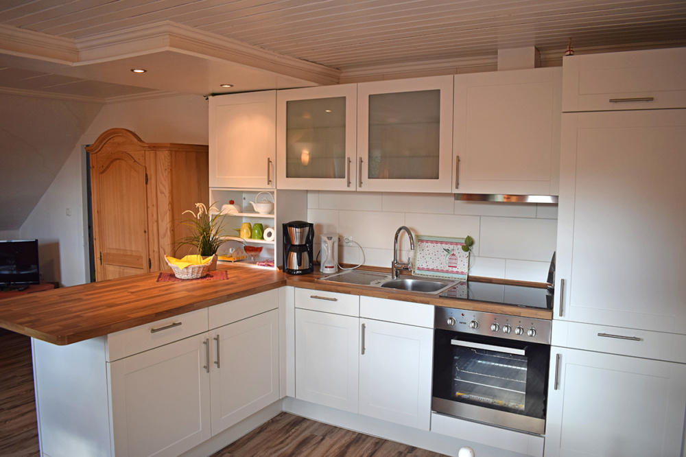 Die Küchen sind ausgestattet mit Kühlschrank, Ceran-Kochfeld (in der Fewo Bootsmann 2-Plattenherd), Backofen (außer Fewo Bootsmann), Kaffeemaschine, Wasserkocher, Toaster und Geschirr.