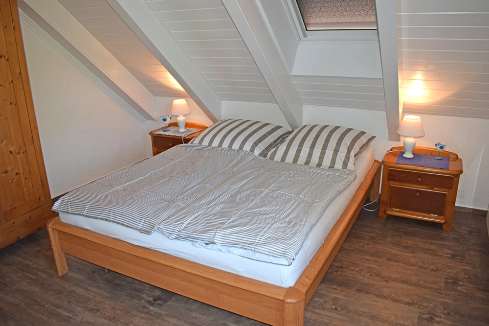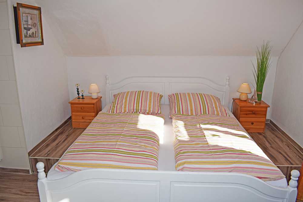 35 m² große Ferienwohnung im Obergeschoss mit Wohn-/Esszimmer inkl. Einbauküche und räumlich abgerenztem Schlafbereich, Bad mit Dusche, Balkon mit Gartenmöbeln.