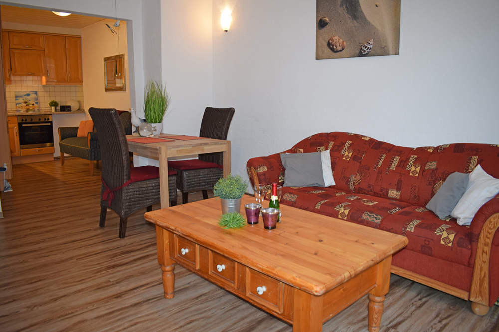 55 m² große Ferienwohnung im Erdgeschoss mit Wohn-/Esszimmer inkl. Einbauküche und einem räumlich abgetrennten Schlafbereich, Bad mit Dusche, Terrasse mit Strandkorb, Gartenmöbeln und Blick auf den Museumshafen.